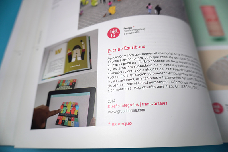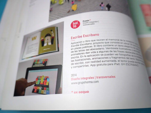 El proyecto Escribe Escribano ganó el Primer Lugar de la Bienal Iberoamericana de Diseño 2016 en Madrid, España en la categoría Diseño transversal. De este proyecto hice la dirección de arte y el diseño del libro.